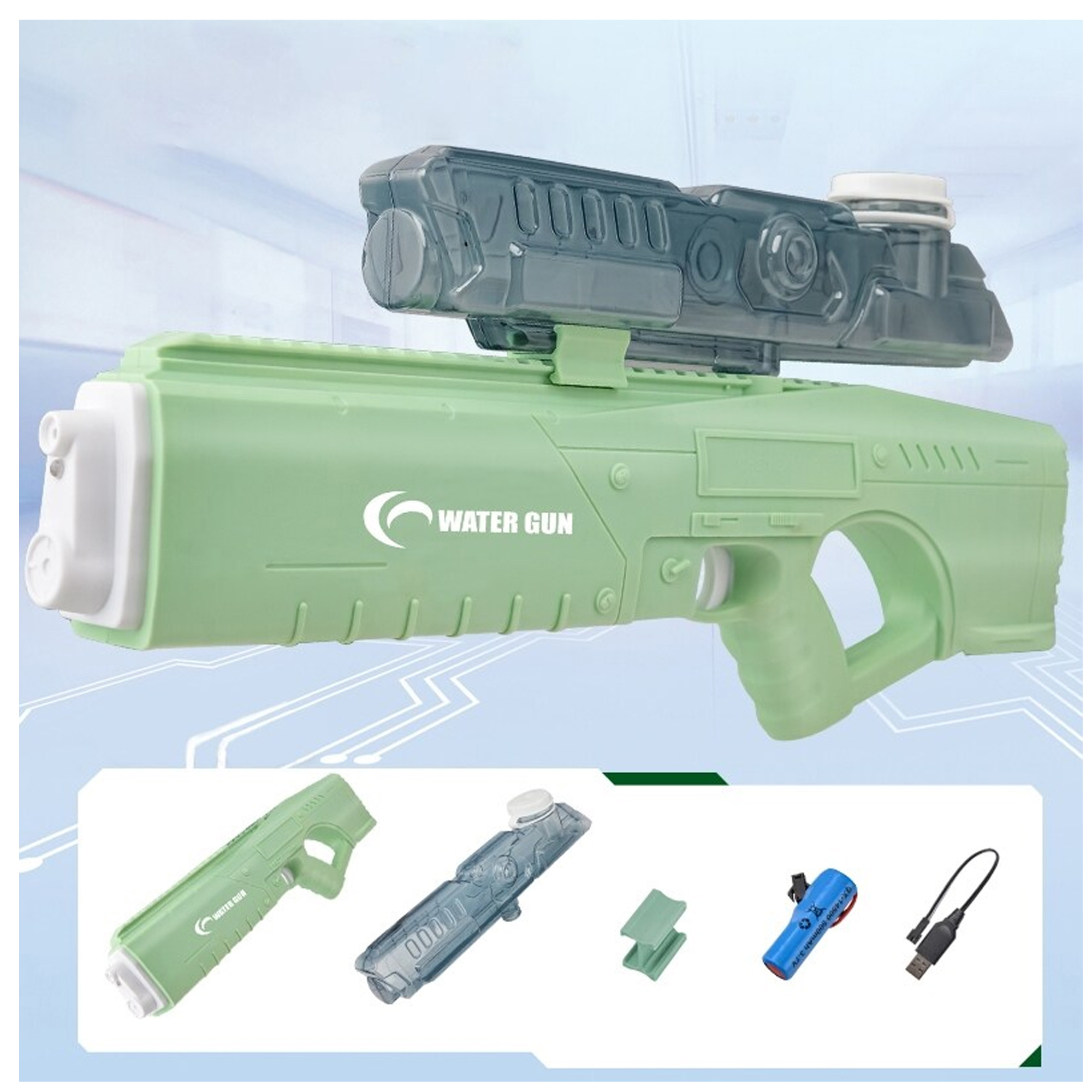 تفنگ آب پاش شارژی یکی از اسباب بازیهایی است که هیچ محدودیت سنی ندارد و در هر سنی که باشید میتوانید نهایت هیجان را با آن تجربه کنید .این تفنگ برای بازیهای گروهی در مکانهایی همچون استخر ، ساحل ، باغ و … بسیار مناسب است و از تفریحات سالم به شمار میآید و میتواند موجبات شادی را در جمعهای خانوادگی و دوستان فراهم کند .ویژگی که این تفنگ را از سایر تفنگهای آب پاش معمولی متمایز میکند ، برقی بودن آن است که با یکبار فشار دادن و نگه داشتن ماشه ، حجم زیادی از آب را خارج میکند و تا فاصله زیادی شلیک کند و با شلیک بی وقفه به حریفان اجازهی واکنش را نمیدهد. ودارای باتری قوی قابل شارژ است