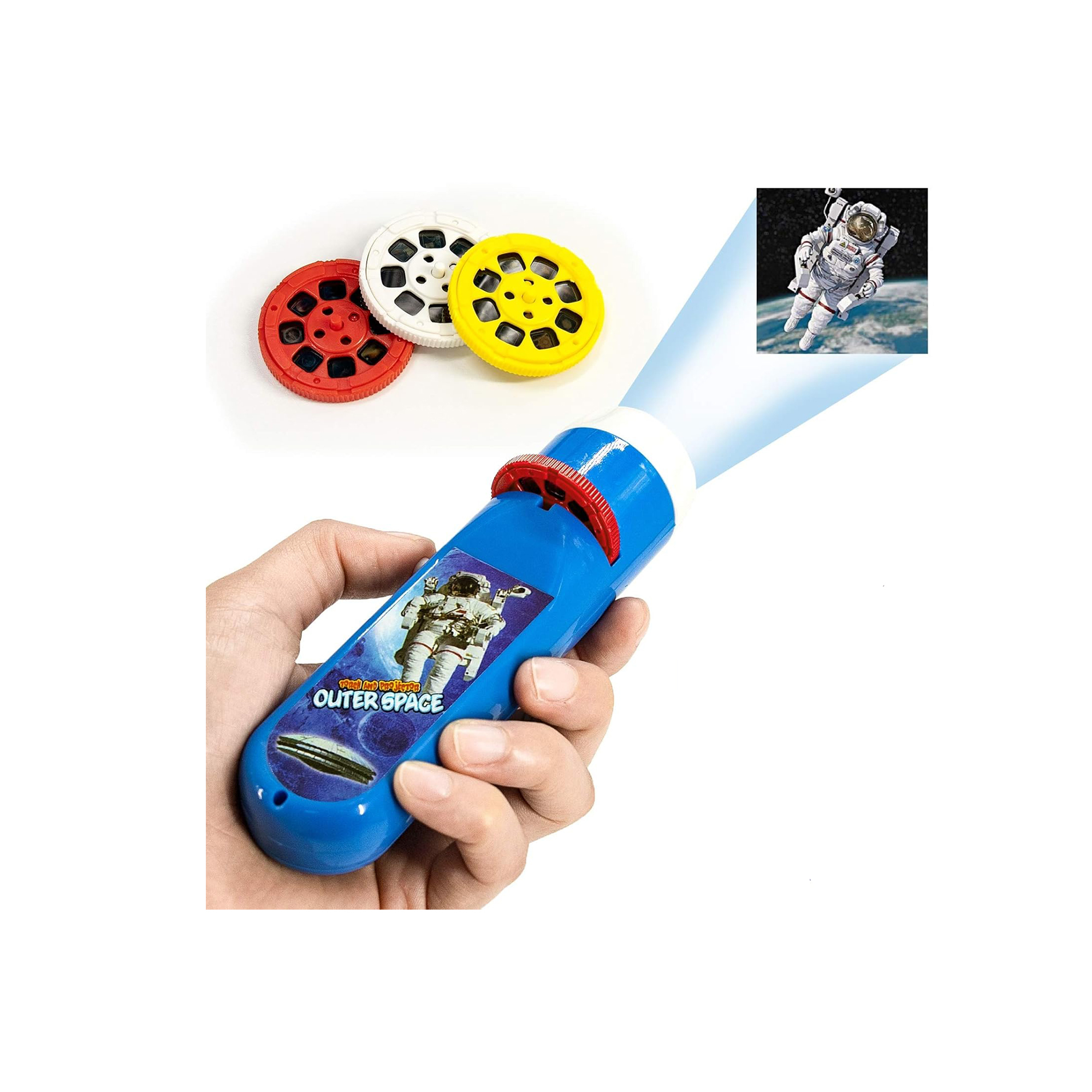 پروژکتور و چراغ قوه مینی کودکان بهمراه 3حلقه فیلم جمعا 24 اسلاید با طرح های جذاب و قشنگ که با چرخاندن حلقه فیلم تصاویر ان عوض میشود این محصول بهمراه 3 حلقه فیلم و خود پروژکتور در این بسته بندی است و نیاز به 2 عدد باطری قلمی دارد
